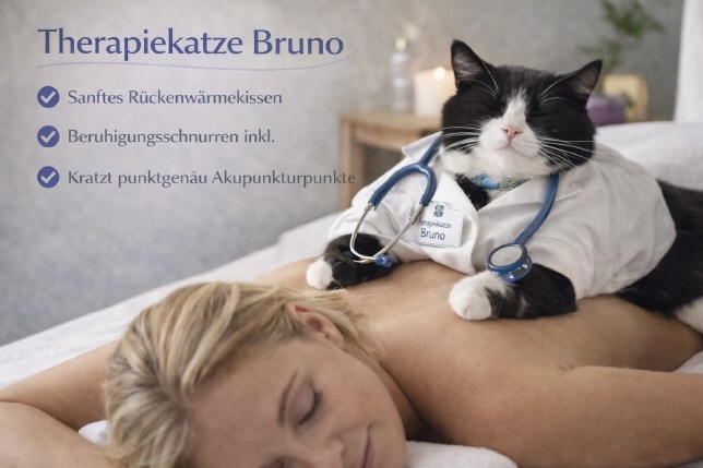 Während Bruno natürlich keine Nadeln setzt und keine Infusionen gibt, ist seine Anwesenheit ein wertvoller Beitrag zum Wohlbefinden. Wer einmal von Bruno begrüßt wurde, weiß: ein bisschen Ruhe, Humor und Katzenzauber können Wunder wirken – zumindest für die Seele.