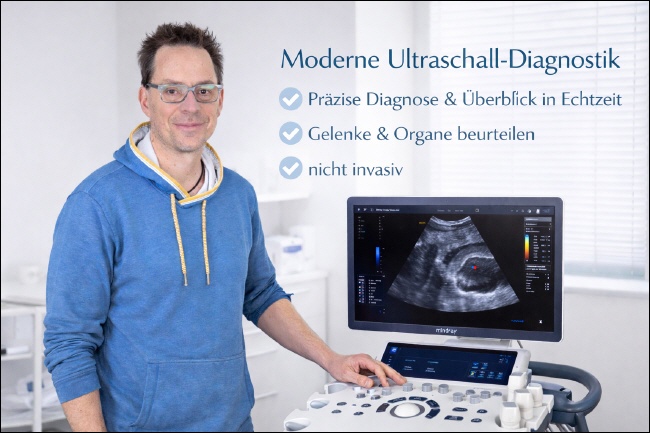 Zu einer sorgfältigen Eingangsuntersuchung gehören neben einem ausführlichen Gespräch, einer umfassenden Anamnese sowie Zeit und persönlicher Zuwendung auch objektive diagnostische Verfahren. Diese können helfen, körperliche Strukturen sichtbar zu machen und Befunde besser einzuordnen. In meiner Praxis biete ich Ihnen daher die Ultraschalluntersuchung (Sonografie) als ergänzende diagnostische Methode an. Die Untersuchung erfolgt mit moderner Technik (Mindray Consona N6) und ist nicht invasiv sowie frei von Strahlenbelastung. |