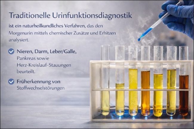 Die traditionelle Urinfunktionsdiagnostik ist ein naturheilkundliches Verfahren, das den Morgenurin mittels chemischer Zusätze und Erhitzen analysiert, basierend auf den ersten Harnanalysen des 20. Jahrhunderts. Durch Farbveränderungen, Trübungen und Ausfällungen werden Funktionen von Nieren, Darm, Leber/Galle, Pankreas sowie Herz-Kreislauf-Stauungen beurteilt. Sie dient der Früherkennung von Stoffwechselstörungen. |